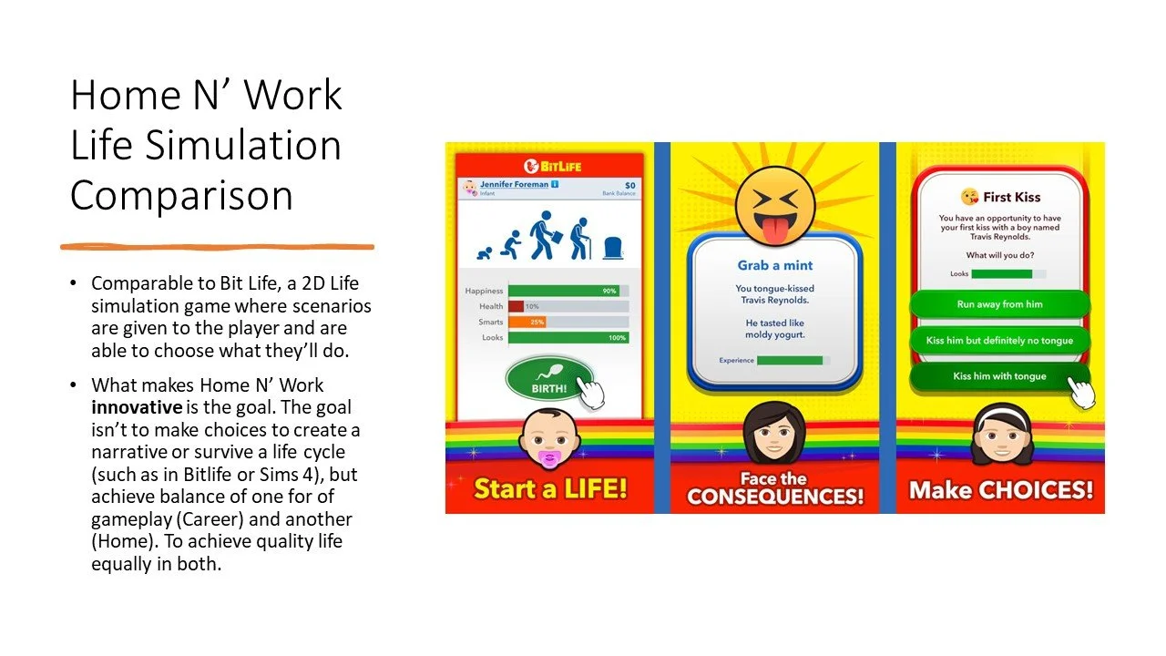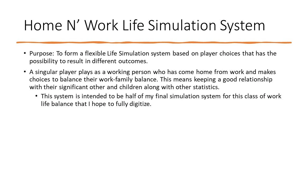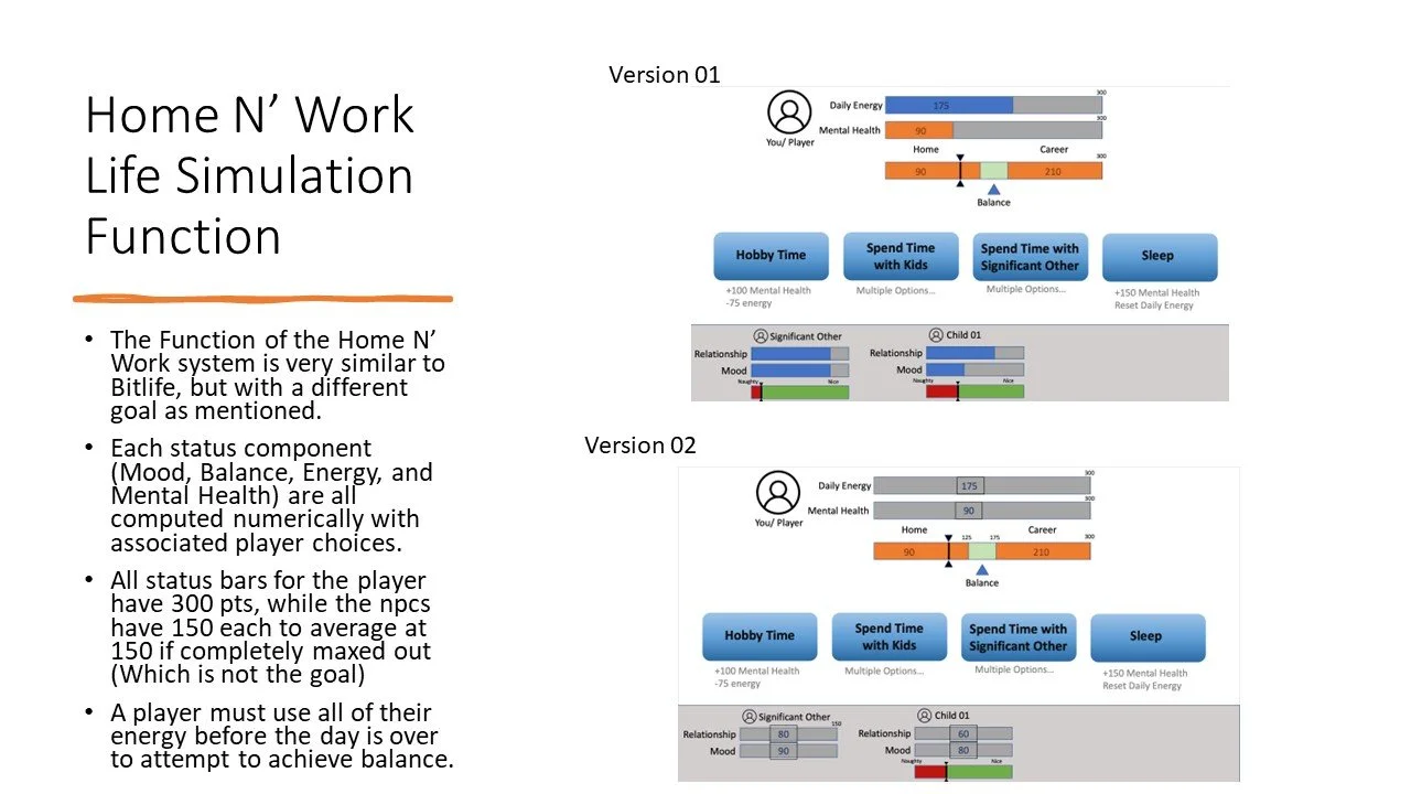 In GAME 734, Systems and Simulation Design, I developed a Life System to test out an idea to possibly implement my thesis topic of Work-Life Conflict into. This was my first round of research into a historical-technical framework based on my system, the viability of the idea, and if the simulation could be interesting or generate any measurable outcome.